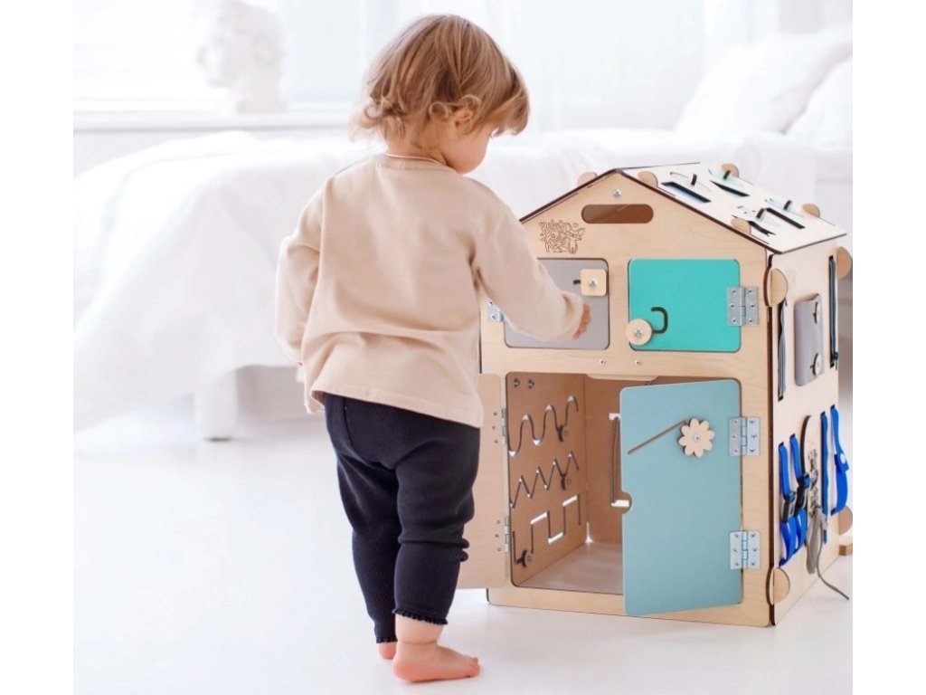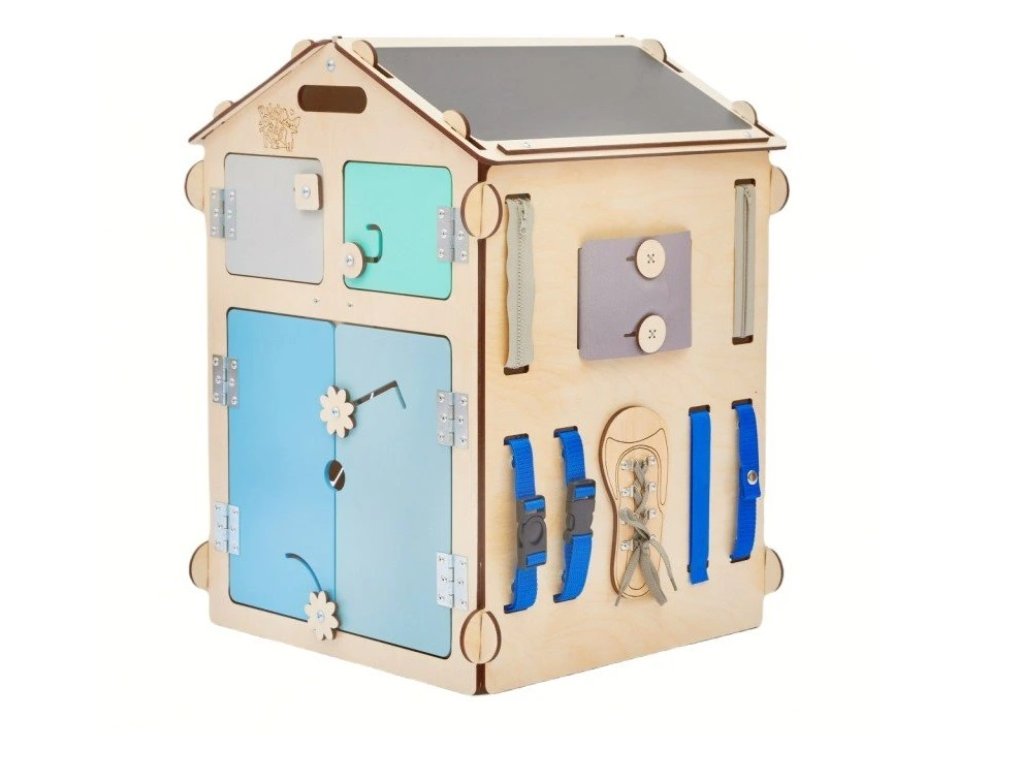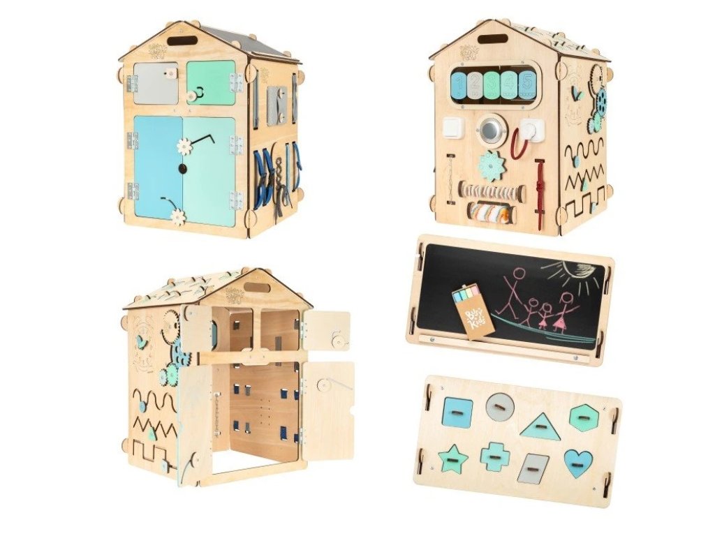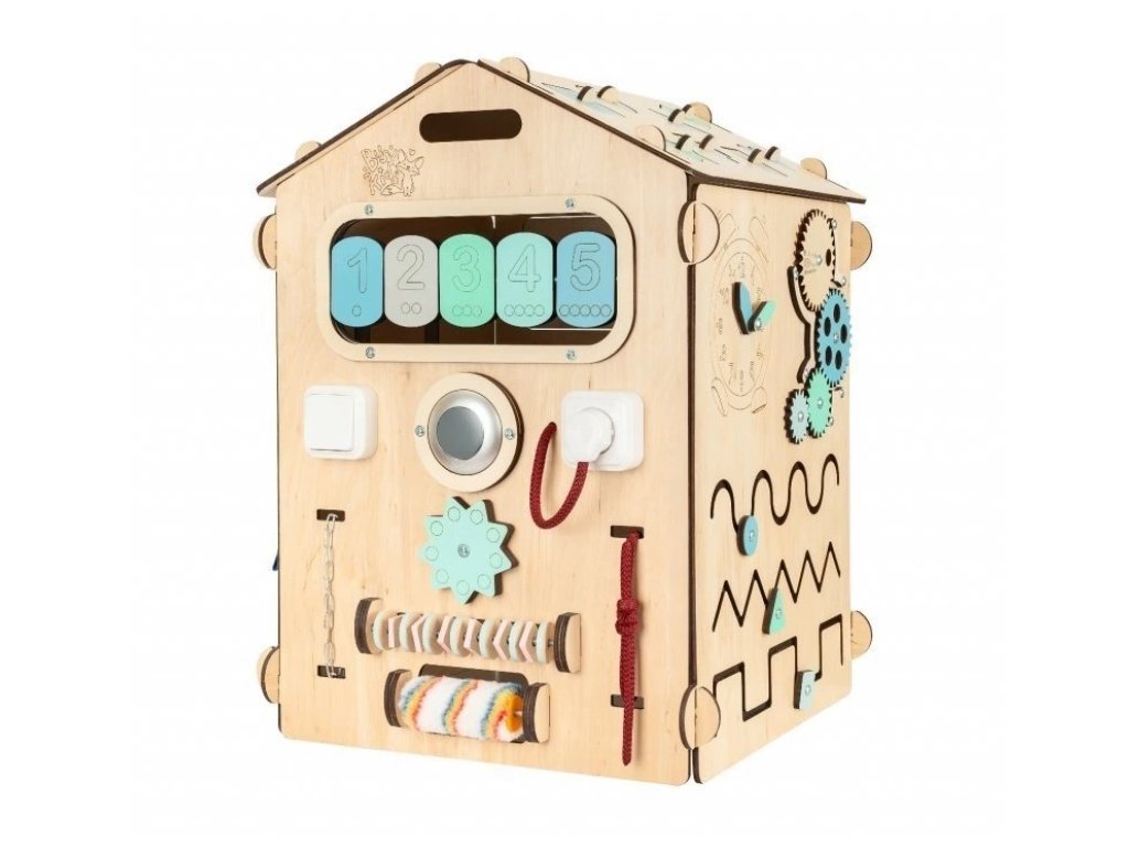 Oblíbená hračka activity board domeček Busy Kids - to je šest ploch plných aktivit : od ozubených koleček, vkládaček, zipů a zapínání, přes svítidlo, vypínač, čistič bot až po tabuli.
