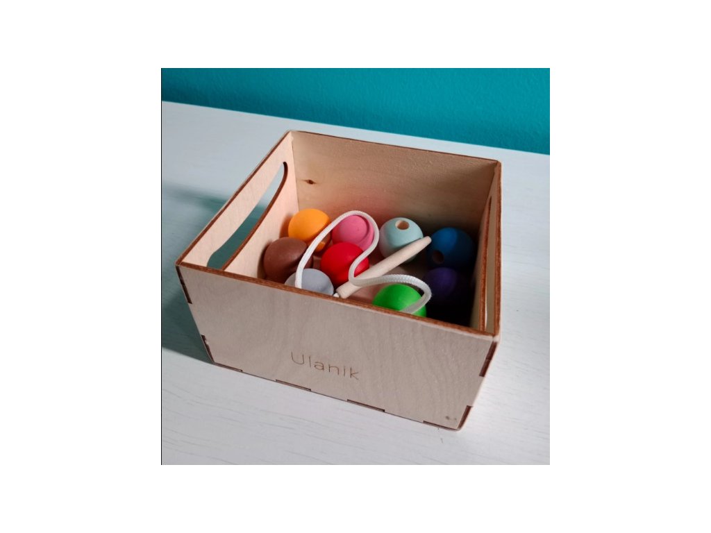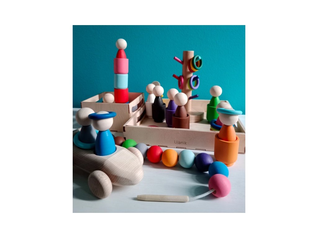 Čtveřice dřevěných hraček pro trénování barev, vkládání, nasazování, navlékání či volné hraní
