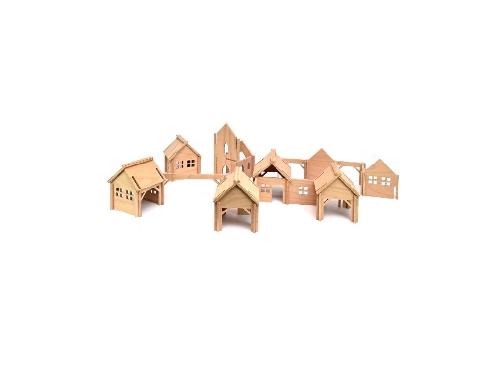 Také patříte mezi milovníky dřevěných roubených vesniček ze starých dob? S touto stavebnicí se objevíte přímo v prastarém skanzenu. Děti snadno postaví pro své panáčky, figurky a loutky vesnici, kde ožívají veškeré tradice. V jedné chaloupce právě okovává kovář Toník své koně, do školy míří Honzík i Mařenka, u potoka stojí starý mlýn a na kopečku kostel. Ve vesnici nechybí stodola, seník ani stáj pro zvířata, malý domeček pro sousedy a vejměnek pro babičku s dědou. Právě zde na statku žili Tři bratři předtím, než vyrazili do světa. Tady se stavoval rytíř Bajaja při cestě za princeznou, zatímco hloupý Honza se válel na peci.