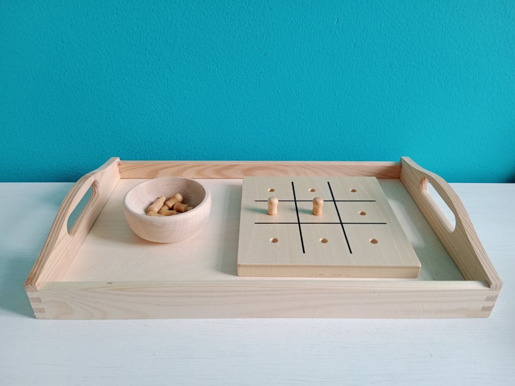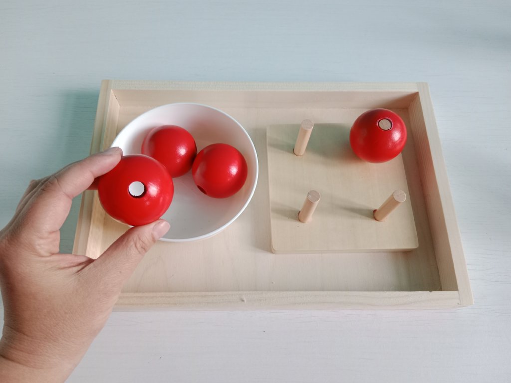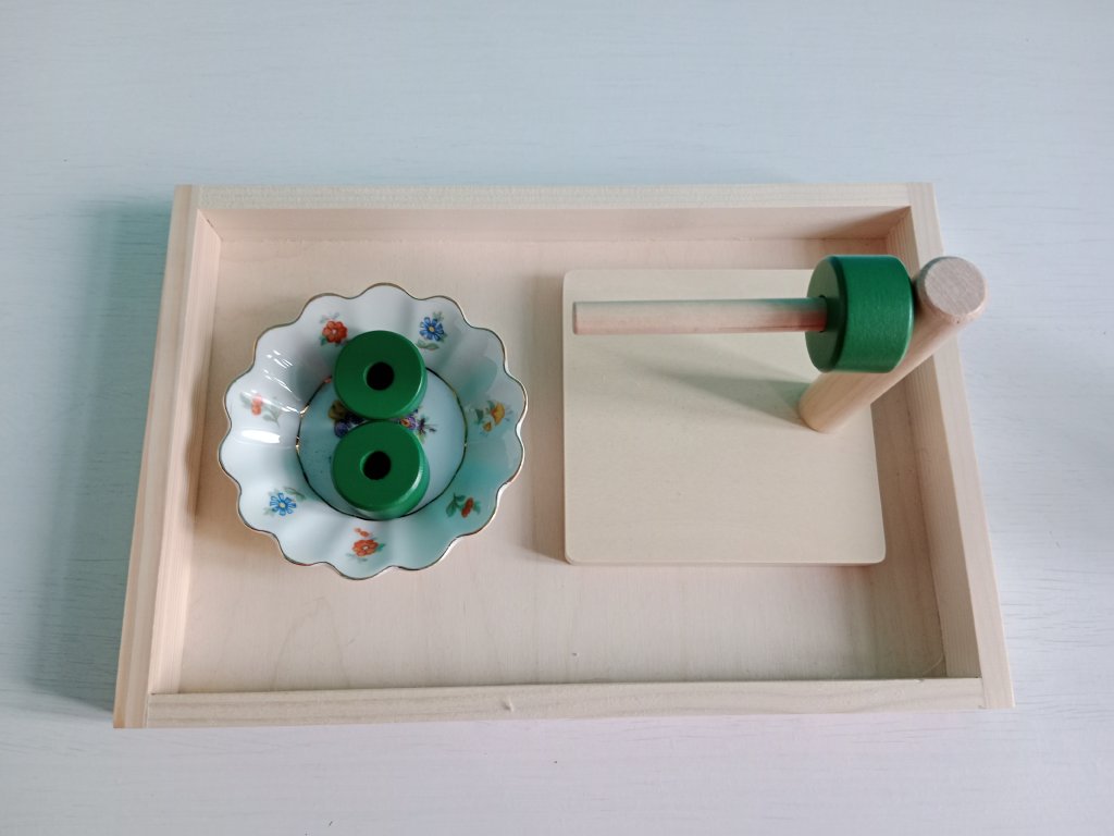Několik pomůcek pro trénování koordinace oko-ruka a trénování špetkového úchopu. Součástí zápůjčky je také tác, jelikož montessori přístup podporuje koncentraci tím, že odděluje činnosti od rušivých elementů.