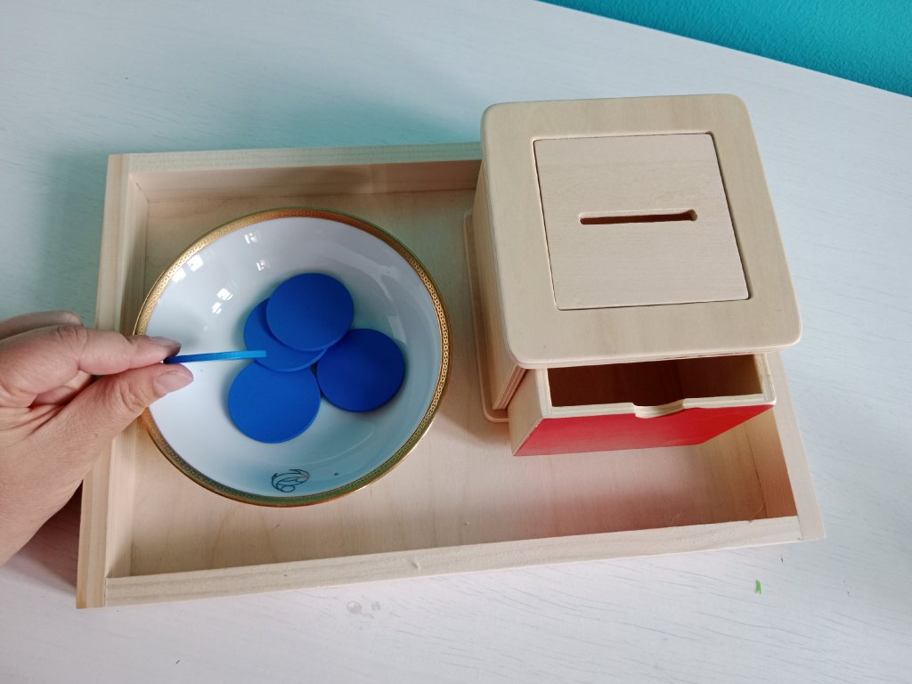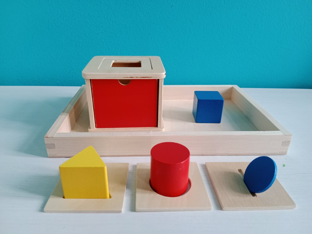Vyměnitelný box na vkládání: Cílem akivity je vkládat různé tvary (žetony, válec, krychle,..) do připravených otvorů. Desky s otvory se dají z boxu vyndat a vyměnit za jiný. Dítě díky této pomůcce podporuje koncentraci, koordinaci oko-ruka, jemnou motoriku a obohacuje slovní zásobu. Vhodné pro děti kolem 18 měsíců.