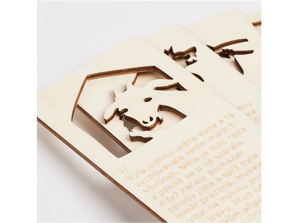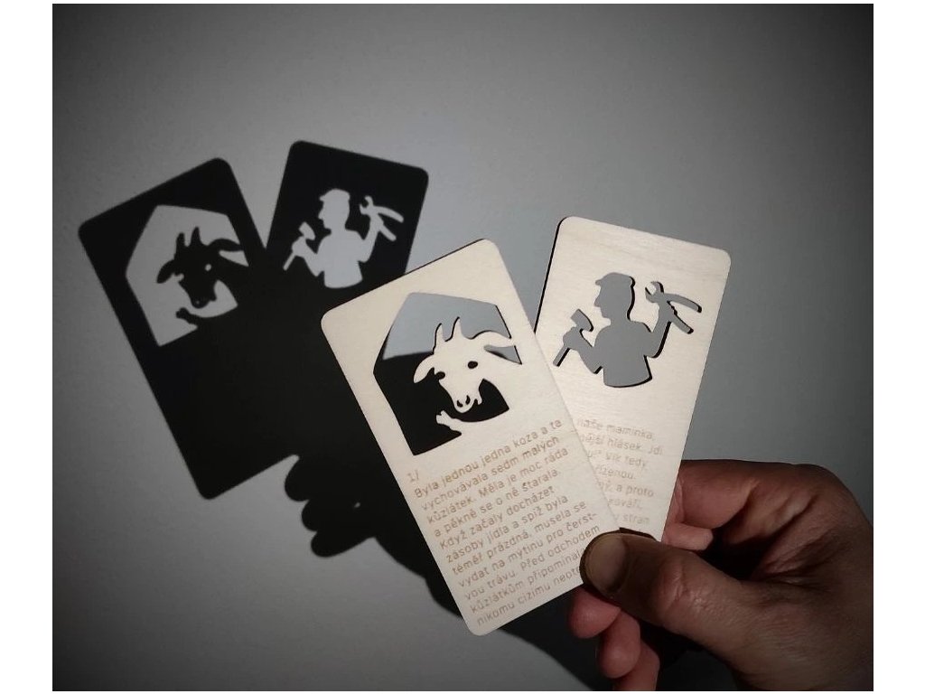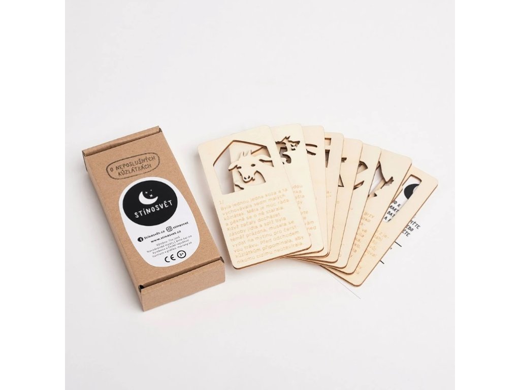 Pohádky od českého výrobce Stínosvět jsou dřevěné kartičky k prosvícení baterkou, mobilem nebo lampičkou. Každá pohádka má osm kartiček s obrázkem a textem, čtení pohádek je tak obohacené stínohrou, kterou děti milují. K mání u nás jsou čtyři pohádky: O neposlušných kůzlátkách, O červené karkulce, O veliké řepě a O kohoutkovi a slepičce, které půjčujeme v sadě.