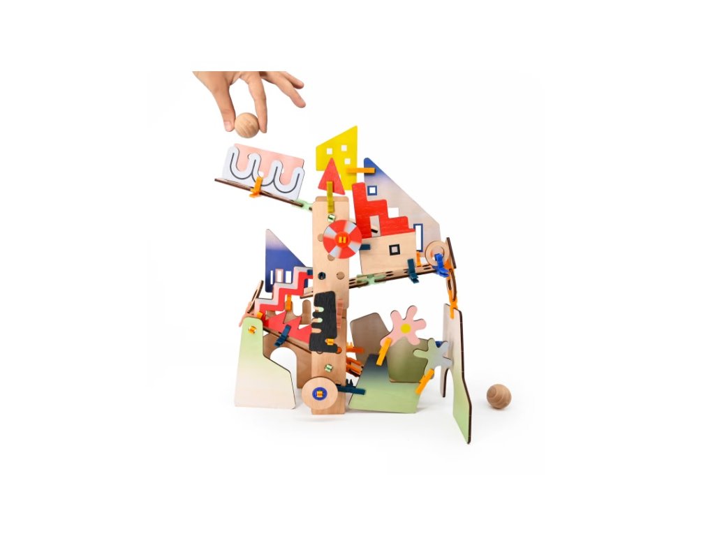 Postav hluboká údolí, vysoké kopce s lesy a domem nebo cokoli, co tvoje fantazie dovolí. V papírovém balení najdeš 32 dřevěných přírodních tvarů, 40 spojek, dřevěnou kuličku, praktický pytlíček a plakát. Díky univerzálním spojkám můžeš postavit kuličkovou dráhu na nekonečně způsobů.